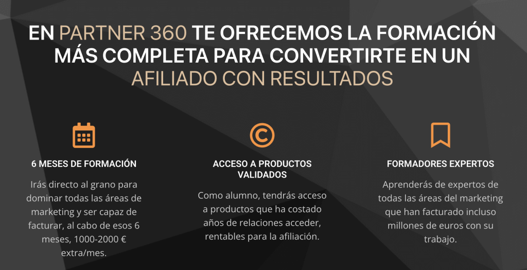 Si comparas cuanto cuesta la formación Partner 360 con otras formaciones disponibles en el mercado, Partner360 destaca por ofrecer un contenido de alto valor, herramientas exclusivas y acceso a mentorías para convertirte en un experto en marketing de afiliados.